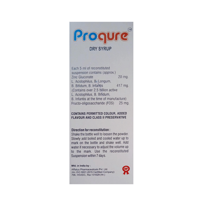 Proqure Dry Syrup is a nutritional food supplement that provides digestive support by relieving abdominal discomfort and bloating. It enhances total wellness by promoting digestion, immunity, and nutrient absorption. It helps to strengthen immunity and the overall gut health of the body. | Key Ingredients: Lactobacilius casel Probiotics Zinc gluconate Lactobacilius acidophilus | Key Benefits: These probiotic supplements help to restore the natural balance of the digestive immune and improve gut health Acts as a powerful probiotic that helps to increase immunity and provides strength to muscles It strengthens the digestive immunity health and helps in nutrient absorption, and maintains healthy yeast levels It helps to reduce gas, bloating, irritable bowel syndrome, diarrhoea, constipation and other bowel discomforts It contains prebiotic fibre that helps to enhance liver function | Direction For Use: Shake the bottle well to loosen the powder. slowly add boiled and cooled water to mark on bottle and shake well. add water if necessary to adjust the volume up to the mark. Use the reconstituted suspension within seven days | Saftey Information: Keep away from direct sunlight Store in a cool and dry place Read the label carefully before use Keep out of the reach of children