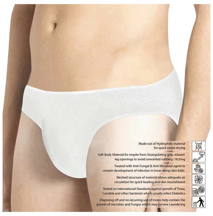 Prowee Men Diabetic Care Disposable Inner Wear All body systems are affected by diabetes including urological health. Prowee Diabetic care disposable brief is specially curated to improve health and Hygiene. It is microbe-protected innerwear that provides intimate wellness and protection. The innerwear is body fitted and is the replacement for any conventional underwear. Diabetics are likely to catch UTI, tinea, candida and bacterial infections. Prowee Innerwear has anti-fungal and anti-bacterial properties that fight such infections. It does not allow mould, fungi and bacteria to grow in the damp skin folds. In case of persistent urine leeks, it would be prudent to shift to Prowee disposable Dribbler / Incontinence Innerwear with an extra layer of padding which copes with the spillage. Diabetics also develop involuntary bladder contractions, or overactive bladder, which causes urinary urgency, increased frequency, and incontinence. Bladder leakage affects the quality of life; Prowee disposable brief saves users from embarrassment and makes them feel confident and comfortable. | Uses: Lightweight body-hugging sweat-absorbent, antimicrobial underwear to prevent possible infection around the intimate areas, can be worn like conventional underwear for internal controls, aperture structure of the material allows good air circulation and prevents anaerobic growth | Product Specifications and Features: Made with soft, lightweight and body-hugging partially biodegradable viscose blend material Antimicrobial to provide additional support for recovery from infection Correct fit for men's body shape and registered design Compact pack with ease of disposal with an inbuilt pouch | Directions For Use: Unpack and turn inside out before wearing Wear a normal brief Dispose of as directed on the box | Safety Information: Replace once soiled Do not reuse In the highly unlikely state of irritation or rash, discontinue the usage Do not flush Dispose of in the dry waste bin Not suitable for unusual stretch