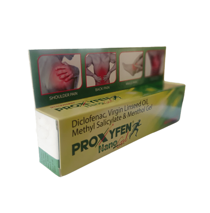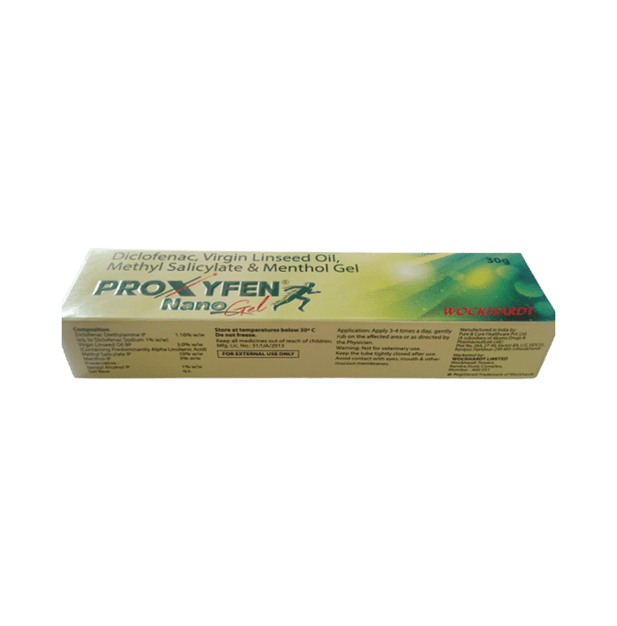 Proxyfen Nano Gel is a topical pain relief gel that is available in a 30g tube. It is a pain killer that provides relief from all types of pain like back pain, joint pain, headaches, neck and shoulder pain and muscle aches. This unique combination is formulated with nanotechnology in a nano-gel form which helps in faster absorption and quicker action. | Key Ingredients: Diclofenac Linseed oil Methyl Salicylate Menthol | Key Benefits: Diclofenac and Linseed oil reduce pain and inflammation Methyl salicylate and menthol are strong counter-irritants that provide a soothing hot and cold sensation Proxyfen Nanogel combines the power of diclofenac gel and other natural pain killers to provide quick and effective relief from all types of pain like back pain, joint pain, headaches, neck and shoulder pain and muscle aches immediately due to its nanotechnology | Directions For Use: Proxyfen Nanogel can be applied to the site of local pain 3-4 times a day or as directed by the healthcare professional. | Safety Information: Read the label carefully before use Keep out of reach of the children Store in a cool dry place For topical use only. Not to be ingested Avoid contact with eyes and mouth