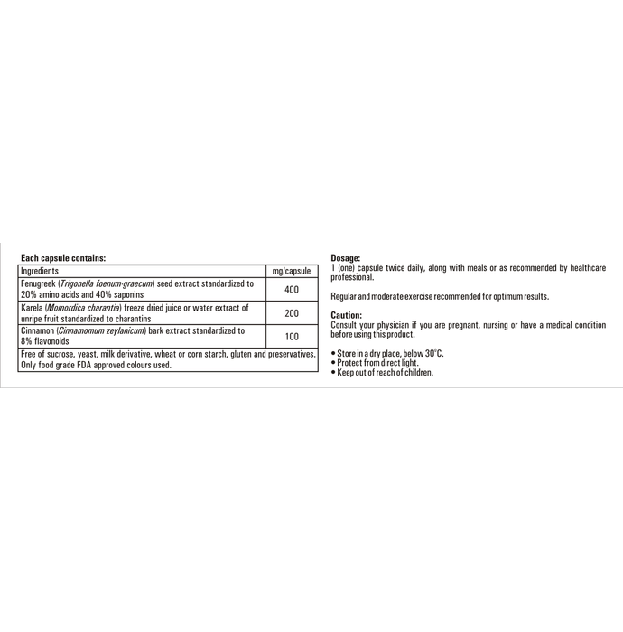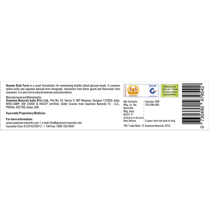 Quantum Naturals Quanto Diab Forte Capsule combines the goodness of well-known anti-diabetic herbs, which helps maintain healthy blood sugar levels effectively. It contains pure and natural extracts of fenugreek, bitter gourd and cinnamon. Saponins and amino acids extracted from fenugreek are rich in natural minerals. It supports vitals like the liver and pancreas. It is 100% natural and free from chemicals and heavy metals. | Key Ingredients: Fenugreek Karela Cinnamon | Key Benefits: Amino acids from fenugreek help to reduce glycosylated haemoglobin (HbA1c) levels It helps maintain healthy blood sugar levels effectively It contains pure and natural extracts of fenugreek, bitter gourd and cinnamon It is 100% natural and free from chemicals and heavy metals It regulates blood glucose levels and Increases glucose uptake and glycogen synthesis | Directions For Use: 1 (one) capsule twice daily, 30 minutes before meals or as recommended by your healthcare professional. | Safety Information: Store in a cool and dry place away from direct sunlight Read the label carefully before use To be avoided by hypersensitive individuals allergic to any of the components Keep out of reach of children