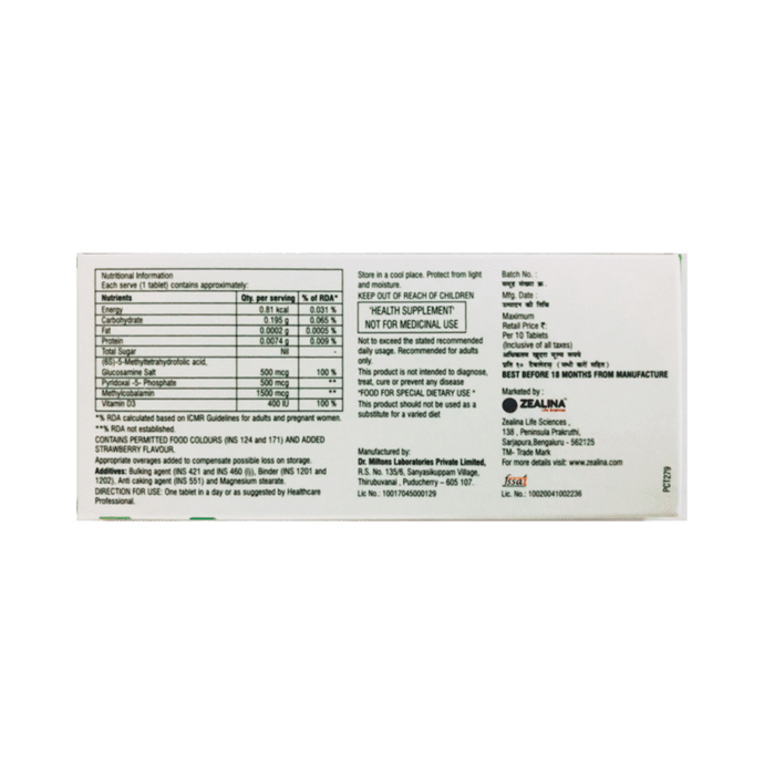 Quinfol Tablet is a health supplement with essential vitamins and nutrients that helps prevent nutritional deficiencies. It can help with low vitamin levels in the body that are not met by the daily diet. | Key Ingredients: Glucosamine Methylcobalamin Pyridoxal 5 phosphate Vitamin D3 | Key Benefits: It can help with low vitamin B12 levels in the body It can help enhance nerve function Vitamin D3 enhances calcium and phosphorous absorption in the body It may help improve immune function | Directions For Use: Use as directed on the label | Safety Information: Read the label carefully before use Store in a cool and dry place, away from sunlight Keep out of reach of children
