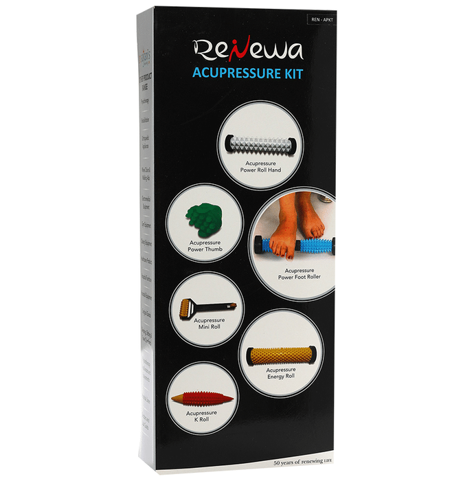 Renewa Acupressure Kit can help provide relief from pressure points in the body. It can also help improve blood circulation. It consists of different acupressure tools for different body parts. | Uses: This kit can help provide relief from stiffness and pressure from different parts of the body. | Product Specification and Features: This kit consists of acupressure power rollers for hand, thumb and foot It also contains an acupressure energy roll, acupressure K roll and acupressure mini roll It is made with skin-friendly, durable material | Directions For Use: Use as advised by your healthcare provider. | Safety Information: Read the label carefully before use Keep out of reach of children
