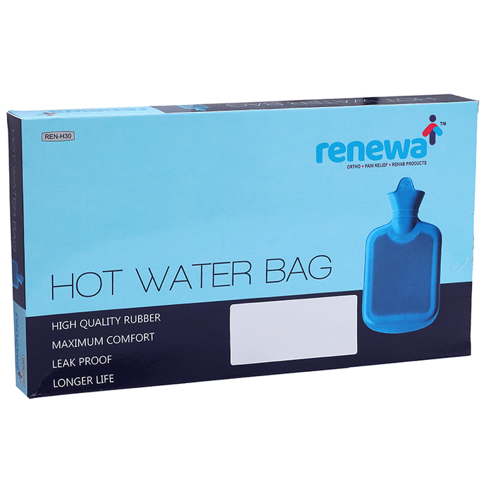Renewa Hot Water Bag helps relieve all muscular pain and provides the best heat therapy for strained and tired muscles. It may soothe menstrual pain, stomach ache, backache, and sports aches and pains | Uses: Helps manage arthritic pain, rheumatic and back pain | Product Specifications and Features: Soft fibre provides comfort and complete coverage of injured area Helps provide relief from muscular and menstrual pain The small and compact design makes it more handy and easy to carry The water bag is leakproof and has longer life It is suitable for children and elders | Directions for Use: Fill to a maximum of two-thirds capacity Check the bottle for any leakage by holding the bottle in an upside-down position Expel air by lowering carefully onto a flat surface until water appears at the opening Screw the stopper sufficiently tight to ensure that there is no leakage | Safety Information: Read the label carefully before use Store in a cool and dry place, away from sunlight Keep out of reach of children When filling the bottle, do not use boiling water | Quick Tips: Check the stopper for wear and tear damage at regular intervals Hot water bottle can cause burns- avoid prolonged direct contact to skin Do not use hot water above 65 - 70 degree celcius Fully dry the bottle before storing it Allow boiled water to stand for a couple of minutes before filing the bottle Fill the bottle slowly while holding it by a neck in an upright position