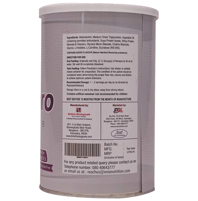 Reno-pro powder is a calorie dense nutritional supplement that contains the goodness of Whey Protein Concentrate, Soya Protein Isolate, Maltodextrin, Protein and Amino acids, and other essential nutrients. Whey Protein Concentrate and Soya Protein Isolate combine to deliver required proteins to the body lost during the dialysis process. Maltodextrin is a rich source of carbohydrates. Reno-pro powder is designed for patients with chronic kidney disease stage 5 or patients maintained on dialysis. Benefits of Reno-pro powder: Low electrolyte content reduces edema Helps control blood pressure Reduces the risk of CV complications due to hyperkalemia Low phosphorous levels reduce the risk of hyper-phosphatemia.
