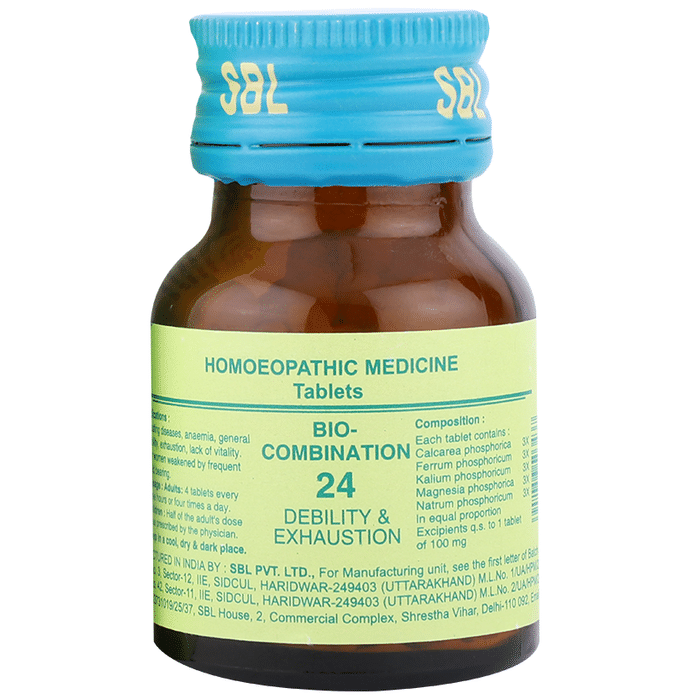 SBL Bio-Combination 24 Tablet SBL Bio-Combination 24 Tablet is a homoeopathic health tonic which helps in improving general health and strength in your body. It is helpful in reversing the ill effects of diseases such as Anaemia which cause debility and weakness. It is also helpful in curing sleep and digestive disorders. Nervous exhaustion, weakness of muscles and body pain can also be relieved using this remedy. It supports general health and well being.