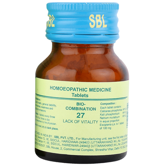 SBL Bio-Combination 27 Tablet SBL Bio-Combination 27 Tablet is a homoeopathic medicine that is useful in the treatment of weakness and debility. Bio combination 27 contains a balanced combination of essential bio-chemic salts which help in maintaining optimum electrolyte balance and vitality in our body. It is also effective in the treatment of lassitude and premature ejaculation.