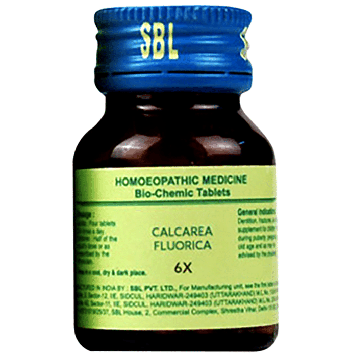 SBL Calcarea Fluorica Biochemic Tablet 6X SBL Calcarea Fluorica Biochemic Tablet is an effective homoeopathic remedy which is used for the treatment of varicose veins, issues associated with piles and for the corrected of blurred vision. It’s a complete health tonic which is also used to treat bleeding gums, relieves rheumatic pains and treats skin conditions such as psoriasis and dry skin. Loss of voice with irritation of throat can also be relieved using this medicine.