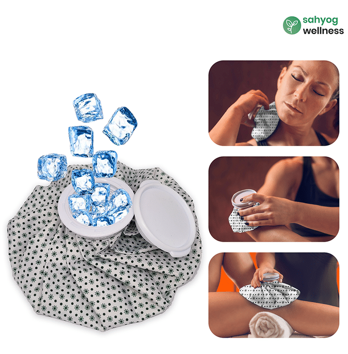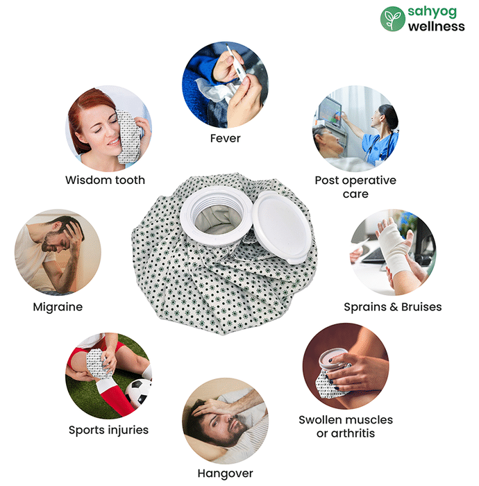 Sahyog Wellness Ice Bag is a reusable ice pack made from a water-repellent material that helps reduce pains and aches. It is leakproof, durable and portable | Uses: It is a reusable ice bag suitable for use during fever, sports injuries, sprains, bruises, toothache or post-operative care to help reduce pain and swelling | Product Specifications and Features: Package dimensions: 23.1 x 10.9 x 7.6 cm; 160 grams Comes with a soft and water-repellent outer cover Its large cap allows easy fitting of ice cubes It easily contours to the body shape | Directions For Use: Open the cap by twisting it in an anti-clockwise direction Put some ice and close the lid by rotating in a clockwise direction Apply to the affected area and get instant pain relief | Safety Information: Read the label carefully before use Squeeze the air out before closing the cap Do not sit or apply excess pressure on the ice bag | Frequently Asked Questions: | What are ice bags suitable for? Ice bags can help minimise pain and reduce swelling as it reduces blood flow by constricting the blood vessels and helps alleviate pain