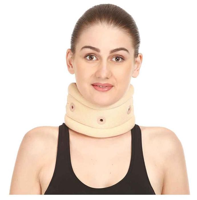 Samson Cervical Collar is pre-formed chin provides chin lock, arrests the neck rotation for strong immobilization. The rest to the chin improves comfort, anatomical and balloon design offers perfect immobilization, minimal contact of the neck, allows use in burn or trauma patients. | Uses: Also called as Neck Brace, it is a medical device which is used to support a person’s neck, especially for people who suffered a traumatic head or neck injury. | Product Specifications and Features: | Hypoallergenic materials: ensure no rash or allergy even on prolonged use, compatible for geriatric use, improves compliance | Tracheotomy opening: allows use along with endotracheal tube, improves air ventilation, comfort and compliance | Two-piece design: allows easy application, firm occipital support, option for varying rigidity | Ethafoam body: is light in weight, nonabsorbent, ensures easy cleaning and maintenance | Directions For Use: Read the user manual for details on how to use. | Safety Information: Read the user manual carefully before use Keep out of the reach of children