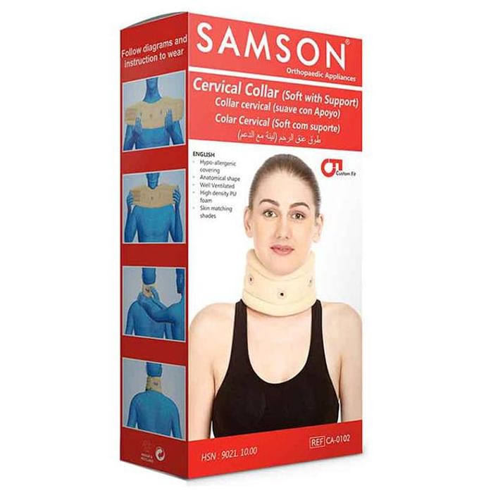 Samson CA0102 Cervical Collar Soft with Support Small Beige Samson Cervical Collar is pre-formed chin provides chin lock, arrests the neck rotation for strong immobilization. The rest to the chin improves comfort, anatomical and balloon design offers perfect immobilization, minimal contact of the neck, allows use in burn or trauma patients.