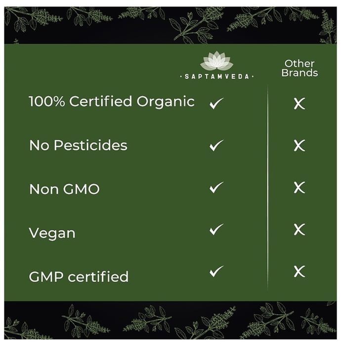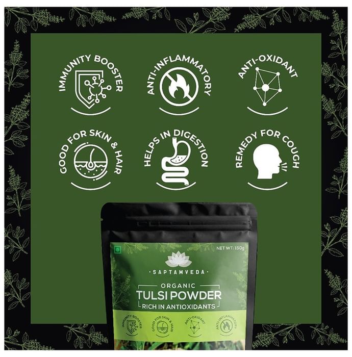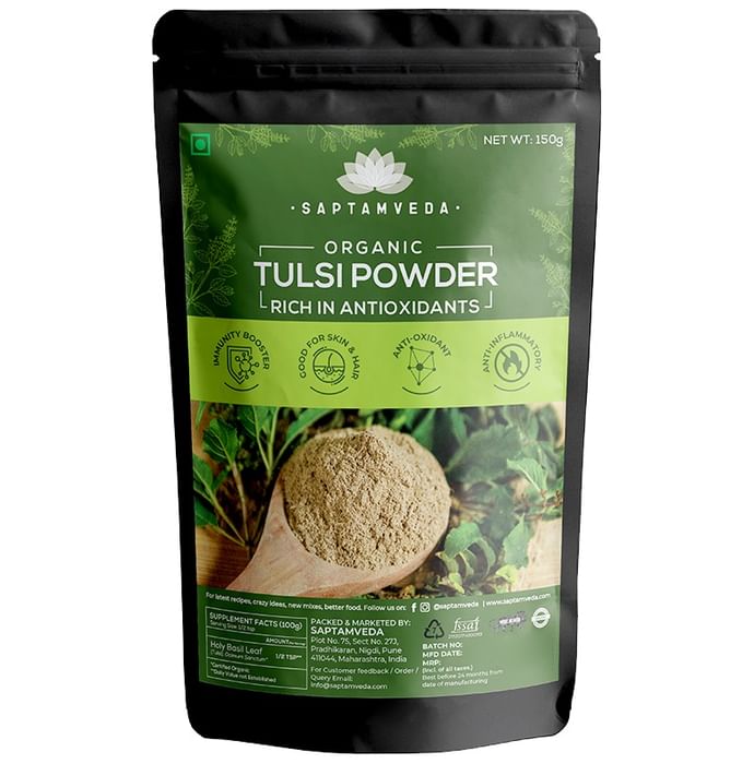 Key Ingredients of Saptamveda Organic Tulsi Powder: Organic Tulsi Powder | Key Benefits of Saptamveda Organic Tulsi Powder: Tulsi powder is known as the perfect remedy for colds and coughs Enriched with antioxidants and anti-inflammatory properties Helps to boost the body's immunity and defence against infections Beneficial for better hair and skin health Tulsi also aids in improving the digestion
