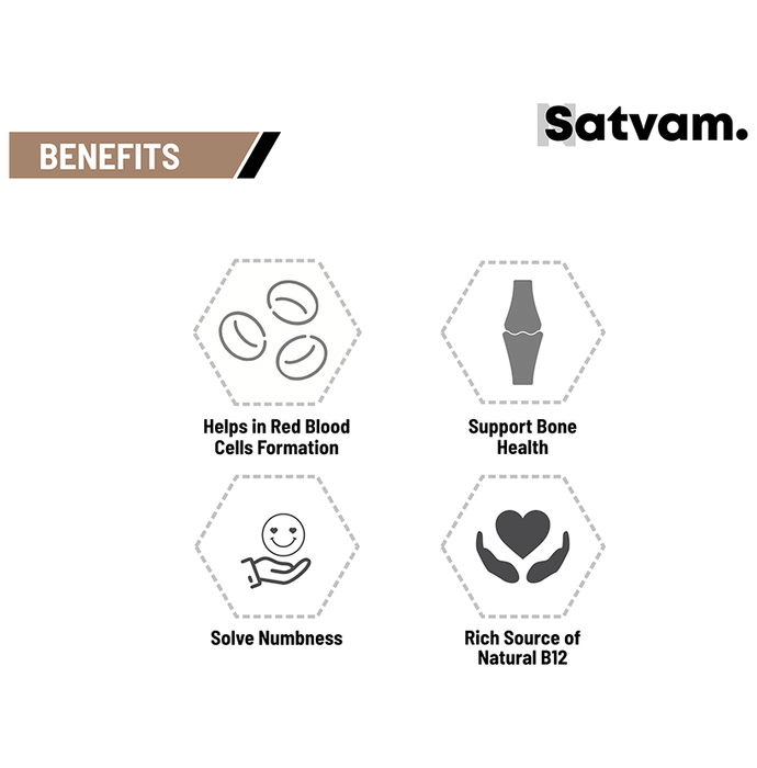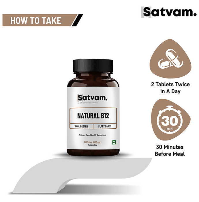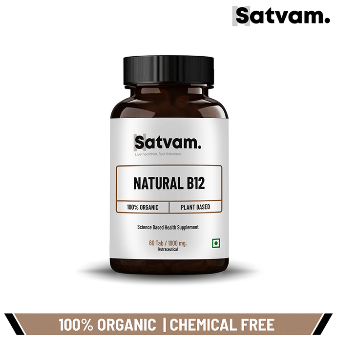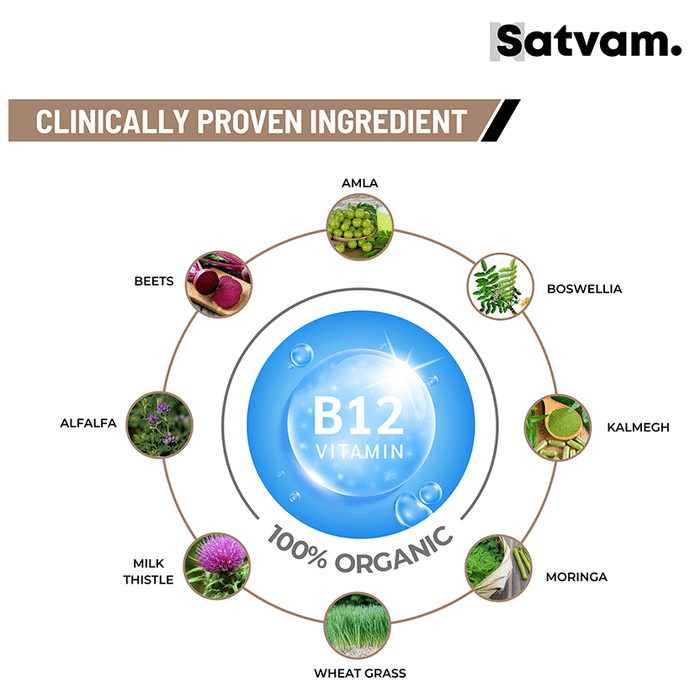 Satvam Natural B12 Tablet It is a dietary supplement formulated with wheat grass, moringa, milk thistle, kalmegh, amla and other ingredients that promote B12 production. It supports total blood count, supports digestion and promotes a healthy nervous system. | Key Ingredients: Alfalfa Wheat grass Moringa oleifera Salai guggul Beta vulgaris ext. (Beet) Silybum marianum ext. (Milk thistles) Andrographis Paniculata ext.(Kalmegh) Phyllanthus emblica ext.(Amla) | Key Benefits: It is a dietary supplement that promotes B12 production It supports total blood count, supports digestion and promotes a healthy nervous system It supports dysentery and improves liver functions It enhances vitality and provides fibre support It may improve symptoms like numbness, tingling, body ache, weakness, focus and anaemia | Directions For Use: Take two tablets twice daily before meals or as directed by your physician | Safety Information: Read the product label carefully before use Store in a cool and dry place away from direct sunlight Keep out of reach of children Consult a doctor before taking any supplement Do not exceed the recommended dosage Pregnant or nursing mothers, children, and people with medical conditions must consult a physician before taking this supplement Do not use if the product appears to be tampered with or the seal is broken