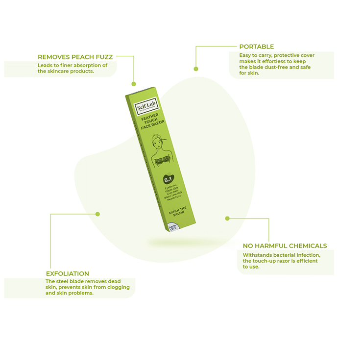 Self Lub 5in1 Feather Touch Face Razor Pink is a multi-purpose face razor that expertly shapes eyebrows, lips, and facial hair, in addition, to gently exfoliating your skin. Plush high-quality razors are designed to give you a zero-cut, zero-bumps experience. | Uses: These razors ensure you get a clean and nick-free shave each time. | Product Specification and Features: It prevents razor burns, redness or other skin irritations caused by regular products that are not skin-friendly The ergonomic design allows you to remove hair very delicately on edges and the fold on the razor allows the blade to stay sharp than usual High-quality single blade designed with fine edges to remove hair from the surface of the skin without giving any cuts The razor is multi-purpose and can be used on facial hair, eyebrows and lips | Directions For Use: Use as directed on the label. | Safety Information: Read the label carefully before use Store in a cool and dry place away from direct sunlight Keep out of reach of children