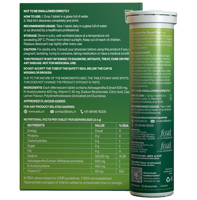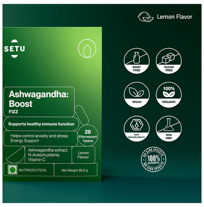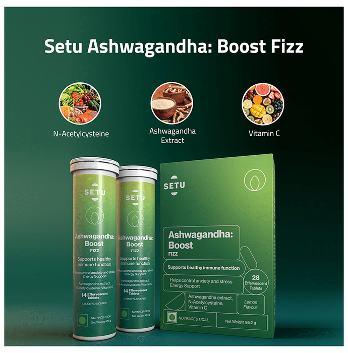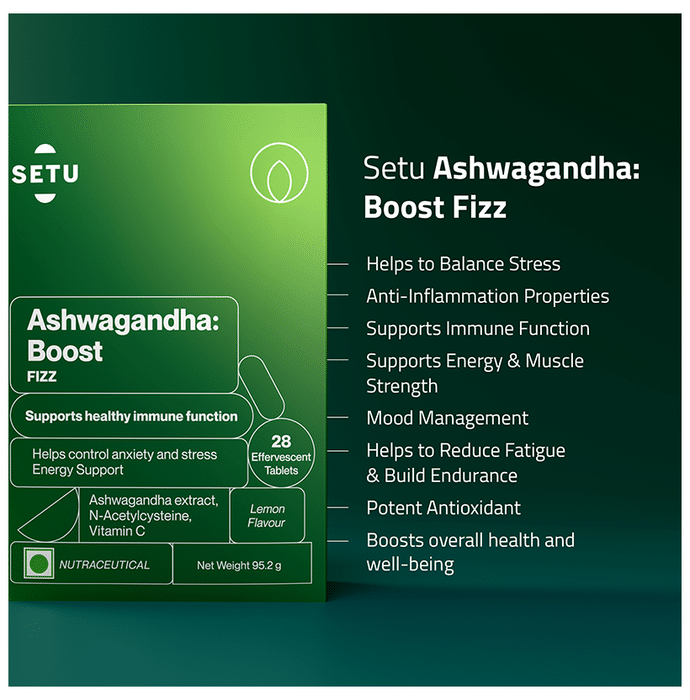 Setu Ashwagandha Boost Fizz Effervescent Tablet Lemon is an energy and stamina-boosting supplement. It can help reduce fatigue and stress and build endurance. It also supports overall well-being. | Key Ingredients: Ashwagandha extract (Withania somnifera) N-Acetylcysteine Vitamin C | Key Benefits: Balance stress and mood: This tablet is packed with ashwagandha, N-Acetylcysteine, and vitamin C, which can help with relaxation, improve mood, and restore calmness Keep the energy up throughout the day: Ashwagandha may help improve athletic performance, strength, endurance, energy levels, and stamina Strong immunity: These ashwagandha tablets have antioxidant and anti-inflammatory properties that can help boost immunity and protect the body from seasonal ailments | Directions for Use: Take 1 tablet daily in a glass of water. | Safety Information: Read the label carefully before use Store in a cool and dry place Keep out of reach of children below 18 years