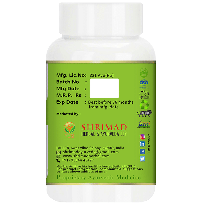 Shrimad Herbal Moringa Capsule is made from natural extracts. Shrimad herbal Moringa is extremely rich in nutrients, with antioxidants, and is an excellent source of vitamin A, vitamin C, iron, protein, fiber, calcium, magnesium and potassium. It seems to help protect cells from damage. | Key Ingredients: Moringa Oleifera Extract 500mg | Key Benefits: It is an excellent source of many vitamins and minerals It is rich in antioxidants and anti-aging properties May protect against arsenic toxicity May help to fight inflammation It benefits in supporting high energy levels with its naturally occurring vitamins, minerals, calcium and proteins | Directions For Use: Take 1 capsule once or twice daily after food, or as directed by the physician/certified dietician/nutritionist. | Safety Information: Read the label carefully before use Store in a cool and dry place away from direct sunlight Keep out of reach of the children If pregnant/lactating or under medication, use only under medical advice of Ayurvedic physician