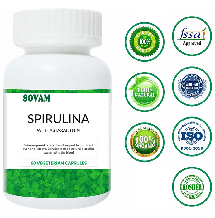 Sovam Spirulina Vegetarian Capsule Sovam Spirulina Capsules is a powerhouse of protein and it is rich in vitamins and is believed to promote weight management. Spirulina is believed to help in fighting allergies and helps to heal wound quickly. It is commonly recognized as one of the world's most nutritionally complete superfoods. It is one of the leading sources of Gamma-linolenic acid (GLA), one of the most powerful anti-inflammatory agents in nature.