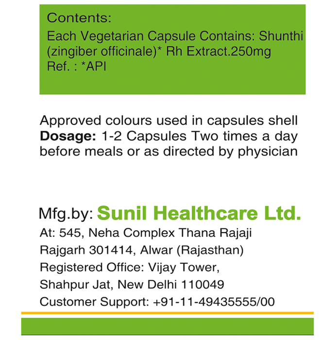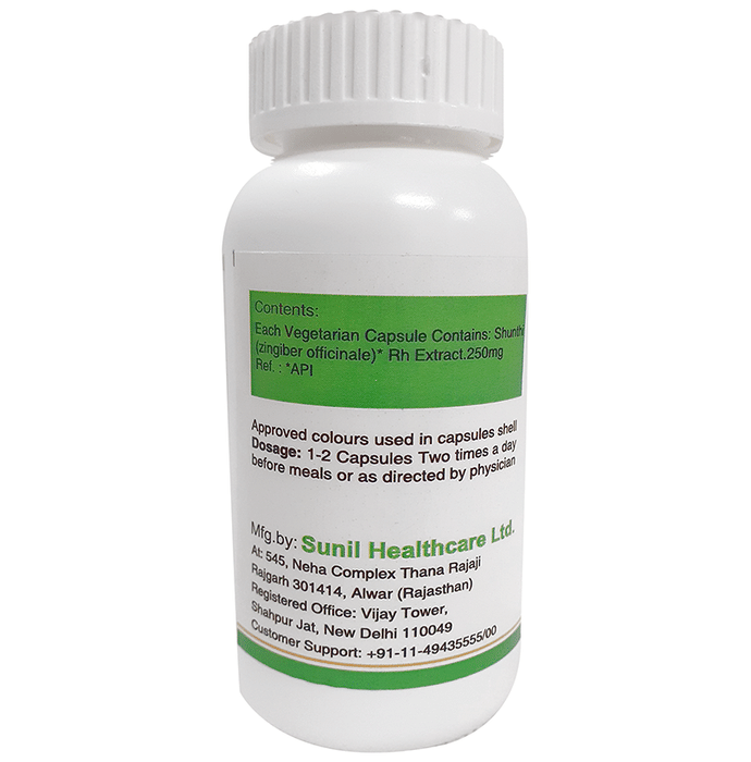 Sunloc Ayush Ayurvedic Shunthi Capsule is useful in relieving stomach issues like indigestion, gas, nausea, acidity and vomiting. It relieves colds, coughs and headaches. Besides, it is a good anti-inflammatory and anti-oxidant. | Key Ingredients: Shunthi Rhizome extract | Key Benefits: The package contains 90 vegetarian capsules per bottle Improves indigestion symptoms: sunthi capsules may be used to provide natural protection against various symptoms of indigestion Healthy blood sugar level: ginger is known to be beneficial in regulating blood sugar levels Ginger helps to detoxify the body. It is especially beneficial during colds as it helps the body to flush out the toxins | Directions For Use: Consume 1-2 capsules twice a day or as directed by the physician | Safety Information: Read the label carefully before use Store in a cool and dry place away from direct sunlight Keep out of reach of the children