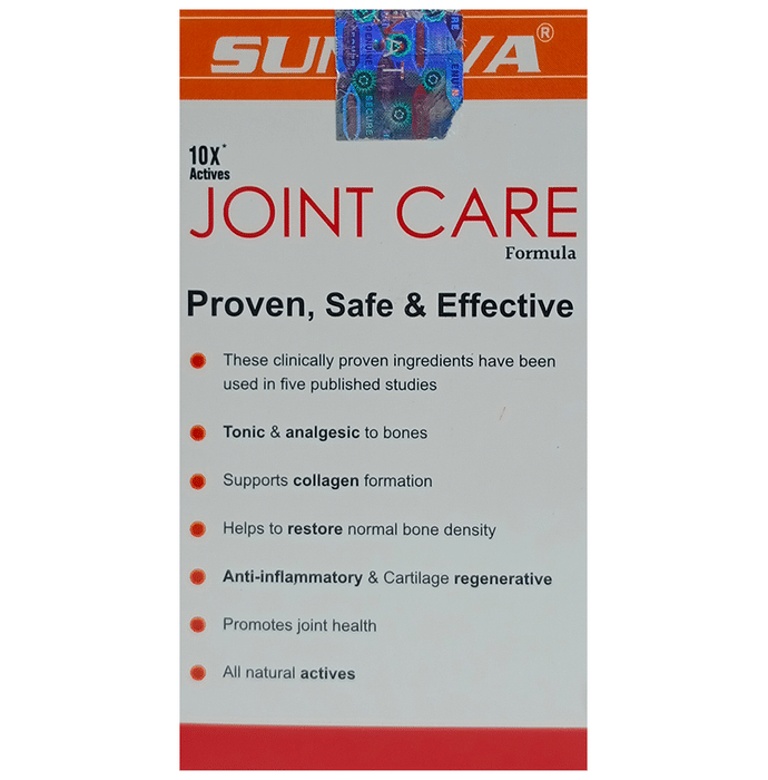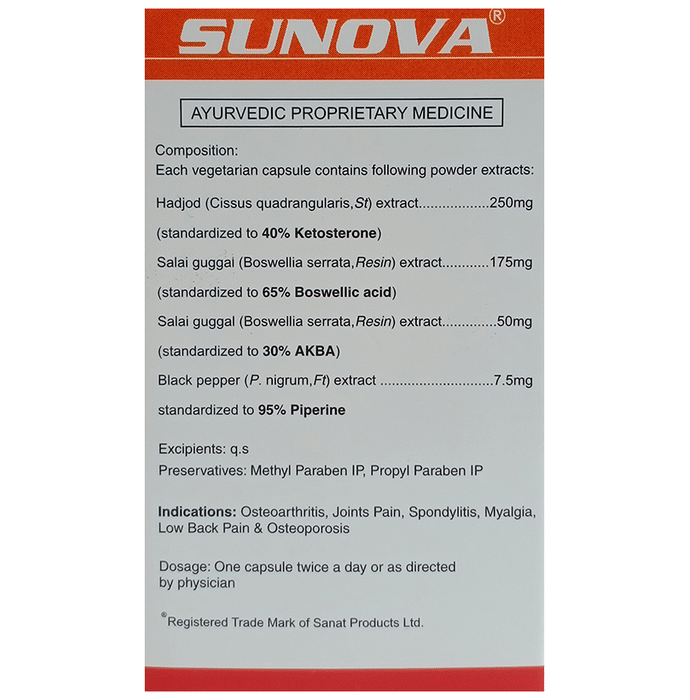 Sunova Joint Care Veg Capsule helps in promoting cartilage generation by restoring damaged joints and strengthening your weak bones. It also gives you relief from joint discomfort. | Key Ingredients: Hadjod (Cissus quadrangularis, St) extract 250mg(Standardized to 40% Ketosterone) Salai guggal (Boswellia serrata, Resin) extract 175mg(Standardized to 65% Boswellic acid) Salai guggal (Boswellia serrata, Resin) extract 50mg (Standardized to 30% AKBA) Black Pepper (P. Nigrum, Ft) extract 7.5mg (Standardized to 95% Piperine) | Key Benefits: Helps in promoting cartilage generation Restores damaged joints Strengthens weak bones Gives relief from joint discomfort Supports collagen formation Helps to restore normal bone density Has anti-inflammatory properties | Directions For Use: One capsule twice a day or as directed by the physician, | Safety Information: Read the label carefully before use Store in a cool and dry place away from direct sunlight Keep out of reach of the children