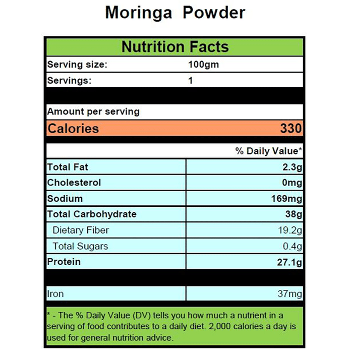 Sunrise Nutri Foods Moringa Powder is organic and US-DA certified product. Moringa Leaf Powder is very useful for diabetic patients as it contains chlorogenic acid, moringinine and quercitine, which are very useful for reducing glucose level in blood. | Key Ingredients: Moringa Powder | Key Benefits: Contains fibers and chlorogenic acid which helps reduce glucose levels in blood It helps in decreasing the reabsorption of glucose in insulin Anti fungal and anti depressant Good for skin and hair Improves metabolism | Directions For Use: As directed by your physician. | Safety Information: Read the label carefully before use Store in a cool and dry place away from direct sunlight Keep out of reach of the children Consult your physician before consuming