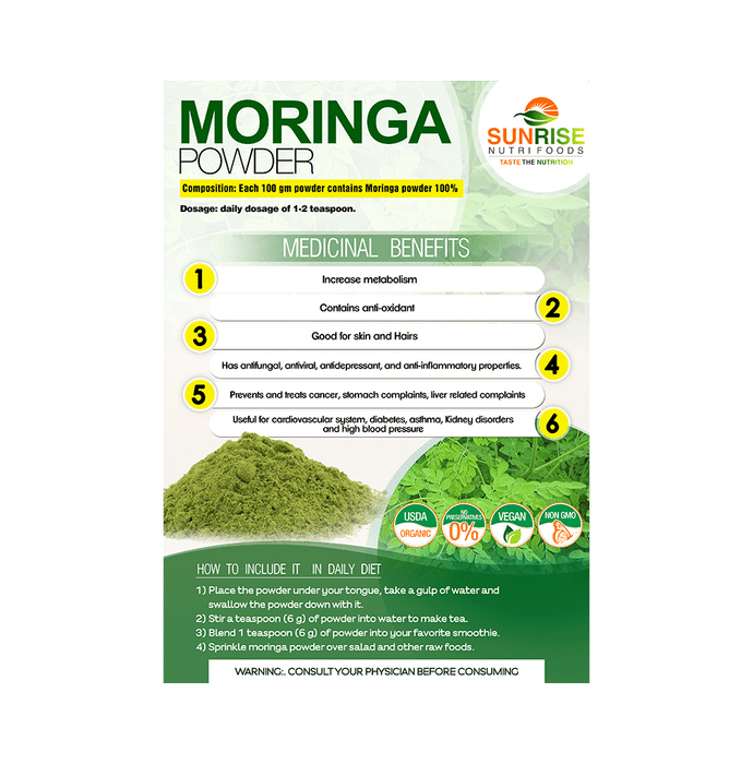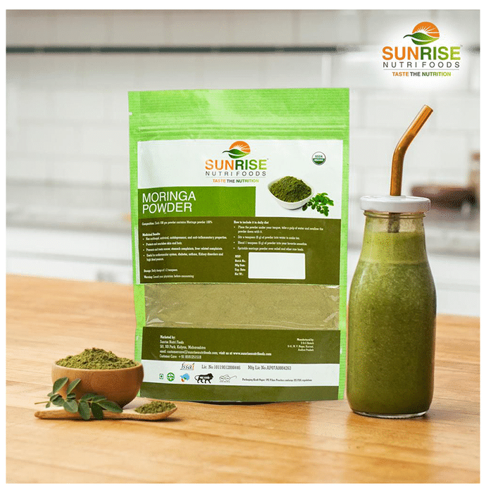 Sunrise Nutri Foods Moringa Powder Sunrise Nutri Foods Moringa Powder is organic and US-DA certified product. Moringa Leaf Powder is very useful for diabetic patients as it contains chlorogenic acid, moringinine and quercitine, which are very useful for reducing glucose level in blood.