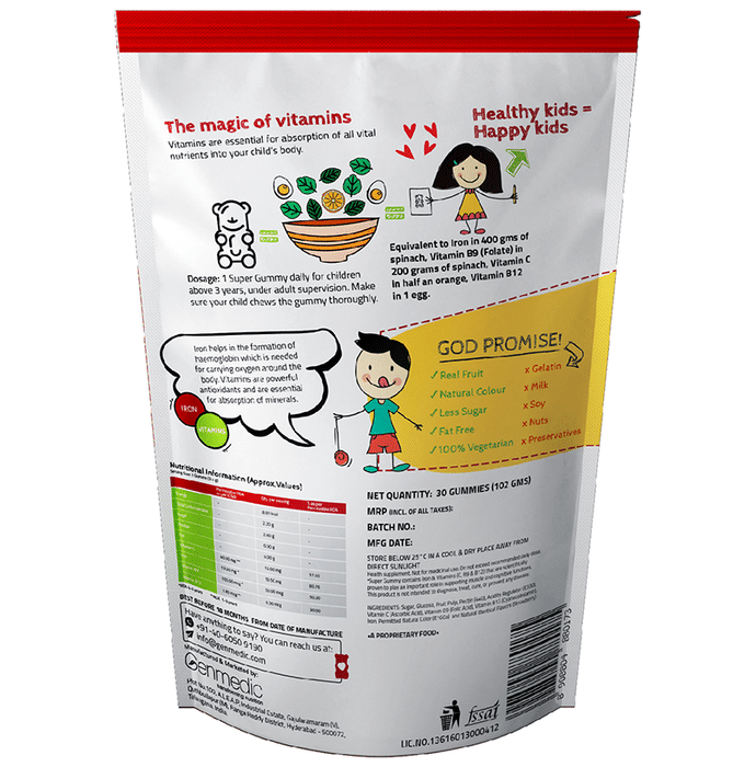 Super Gummy Combo Pack of Calcium+Vitamin D Gummies Masti Mango & Iron+Vitamins Gummies Smashing Strawberry (30 Each) Super Gummy Combo Pack of Calcium+Vitamin D and Iron+Vitamin Gummies is a combo pack of calcium mango gummies and iron-vitamin gummies in strawberry flavour. Today, it is very difficult to cook healthy and nutritious food for your children. It is very important to build immunity for children at an early age. Here, we focus on super gummies to produce the highest quality ingredients with vitamins that are vegan, non-GMO, low sugar, and gluten-free, unlike other products that contain artificial colours and flavourings or added sugar. This means that your child will get all the health benefits without any downside. Our natural multivitamins and iron along with immune support for children help maintain natural defences to keep them healthy.