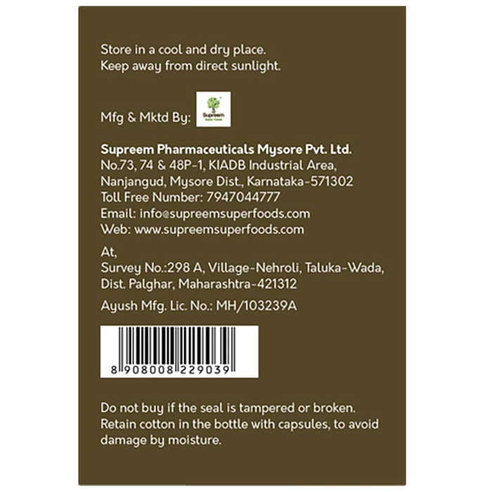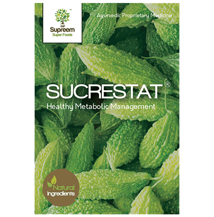 Supreem Super Food Sucrestat Capsule Sucrestat is a bitter melon extract in the form of capsules that regulates blood sugar levels in people suffering from diabetes. It increases glucose uptake and glycogen synthesis in the liver, muscle and adipose tissues, helping maintain normal cholesterol levels and relieve indigestion to improve bowel movement. Bitter melon contains a hypoglycemic compound that is very effective in keeping blood sugar levels down. The extraction of bitter melon is based on Ayurvedic principles where synergy plays an important role in regulating blood glucose without affecting normal metabolism. | Key ingredients: Karvellak extract Excipients q.s. | Key Benefits: These capsules are a bitter melon extract in the form of capsules that regulates blood sugar levels in people suffering from diabetes It aids in the maintenance of normal cholesterol levels and improves bowel movement by increasing glucose uptake and glycogen synthesis in the liver, muscle, and adipose tissues Bitter melon includes a hypoglycemic component that helps keep blood sugar levels under control Bitter melon is extracted according to Ayurvedic principles, in which synergy plays a significant role in managing blood glucose without interfering with regular metabolism | Directions For Use: Use as directed on the label or as directed by the physician. | Safety Information: Store in a cool and dry place Keep out of the reach of children Do not use if the seal is missing or damaged
