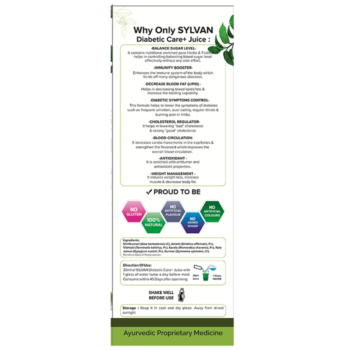 Sylvan Ayurveda Diabetic Care+ Juice (1Ltr Each) Sylvan Ayurveda Diabetic Care+ Juice Sylvan Diabetic Care Juice is prepared using the best quality natural ingredients that help to maintain weight and control blood sugar levels without any side effects. It also helps to purify the blood and weight management, boost body immunity, promote digestion and enhance the defence mechanism of the body. This completely natural juice is free from sugar, gluten, added colours and flavours.