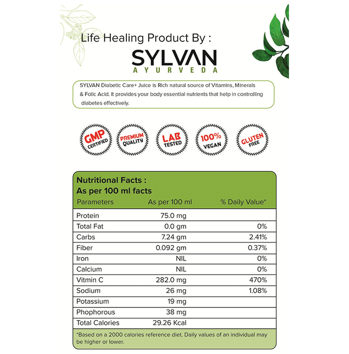 Sylvan Ayurveda Diabetic Care+ Juice Sylvan Diabetic Care Juice is prepared using the best quality natural ingredients that help to maintain weight and control blood sugar levels without any side effects. It also helps to purify the blood and weight management, boost body immunity, promote digestion and enhance the defence mechanism of the body. This completely natural juice is free from sugar, gluten, added colours and flavours. | Key Ingredients: Karela Kala jamun Neem Aloe vera Amla Haritaki Vibhakti | Key Benefits: It contains nutrition enriched pure herbs and fruits that help in controlling and balancing blood sugar levels without any side effects It enhances the body's immunity which fends off many disastrous diseases It induces weight loss, increases muscle, decreases body fat and supports weight management Enhances the defence mechanism and enhances the body’s stamina This formula helps to lower the symptoms of diabetes such as frequent urination, overeating and burning pain in the limbs | Directions For Use: Take 30 ml of juice in 50-60 ml of normal water before a meal or as prescribed by the physician. | Safety Information: Store in a cool and dry place Keep away from the reach of children Do not use if the seal is damaged or missing Do not mix bleaching powder with other chemicals