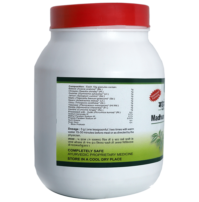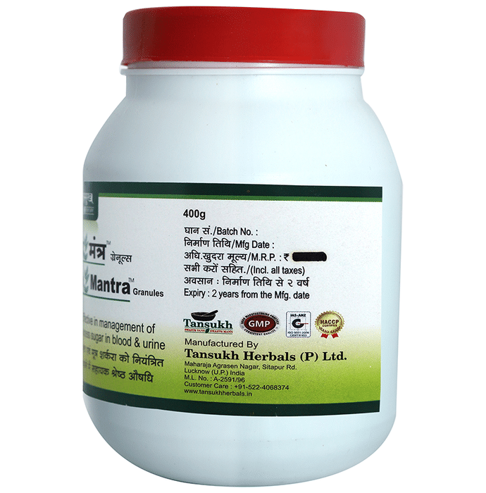 Tansukh Madhumeh Mantra Granules is an effective herbal antidiabetic combination. It provides a support system to control elevated blood sugar levels. It also controls polyurea, polydipsia and lethargy. | Key Ingredients: Acacia arabica Swertia chirata Gymnema sylvestra Syzygium cumini Trigonella foenum-graecum Azadirachta indica Curcuma longa | Key Benefits: Improves pancreatic secretions and can be used for a long period of time without any side effects Useful in treating weakness and lethargy, tiredness, loose muscle and helps in improving strength and immunity Has potent anti-ageing properties and provides a support system to control elevated blood sugar levels | Directions For Use: Take 1 teaspoonful (5 g) of Tansukh Madhumeh Mantra Granules two times daily with warm water 30 minutes before meals or as directed by the physician. | Safety Information: A dietary nutritional supplement not for medicinal use Read the label carefully before use Do not exceed the recommended dose Keep out of the reach of children Store at a cool and dry place Should be protected from direct sunlight