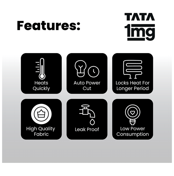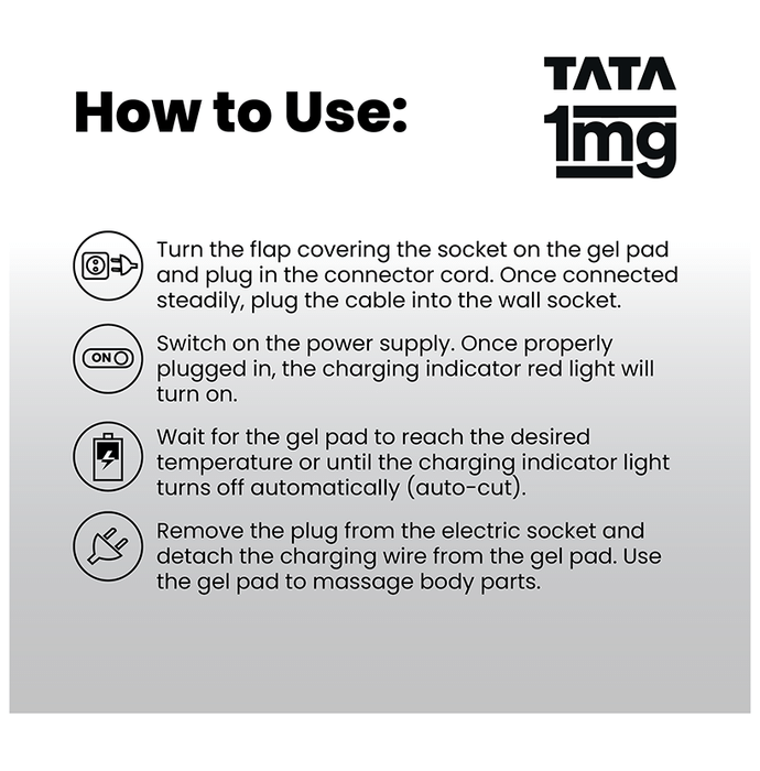 Tata 1mg Ortho Electric Heating Gel Pad with Auto-Cut & Quick Heating Feature is the ideal way to get relief from pain. It is suitable for the back, shoulders, neck and knees. The heating gel pad has various interesting features. Primarily, it heats quickly and is crafted with high-quality fabric. Moreover, it locks heat for a longer period which makes it effective. | Uses: It is primarily used to provide relief from back, neck, shoulder and knee pain. | Product Specifications and Features: The gel has a quick heating formulae It features an auto power cut that prevents damage Has an insulator to lock heat for a longer period Crafted with high-quality fabric that prevents damage It is leak-proof which makes it safe-to-use It has a low power consumption The product is backed by a 6 monthly warranty Warranty of the product is limited to manufacturing defects only The warranty does not cover any external accessories (such as the battery, cable, carrying bag), damage caused to the product due to improper installation by the customer, damage, misuse, tampering, self Repair, leakage or burnt, and normal wear and tear | Directions For Use: Turn the flap covering the socket on the gel pad and plug in the connector cord. Once connected steadily, plug the cable into the wall socket Switch on the power supply. Once properly plugged in, the charging indicator red light will turn on Wait for the gel pad to reach the desired temperature or until the charging indicator light turns off automatically (auto-cut) Remove the plug from the electric socket and detach the charging wire from the gel pad. Use the gel pad to massage body parts | Disclaimer: Product images are shown for illustration purposes only and may not be an exact representation of the product | Safety Information: Read the label carefully before use Store in a cool and dry place away from direct sunlight Keep out of reach of the children Do not use the bag during charging