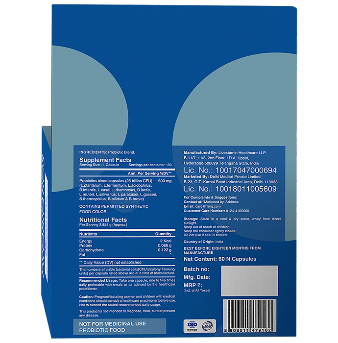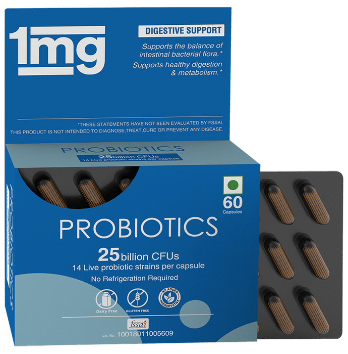 1mg Probiotics 25 Billion CFUs Capsule helps in providing digestive support by relieving abdominal discomfort, gas, and bloating. It contains 25 billion CFUs and 14 live probiotic strains per capsule which help in improving digestive health. It not only helps in the absorption of nutrients but also promotes the immunity level. | Key Ingredient: Probiotics blend capsules (25 billion CFU) | | Key Benefits: Supports a healthy digestive system Helps in balancing intestinal bacterial flora Beneficial in boosting the immunity level Useful in preventing and treating diarrhoea Helps in improving intestinal health Aids in reducing abdominal ailments such as gas and bloating | Directions For Use: Take one capsule, one to two times daily, or as directed by the physician. | | Safety Information: | Shelf Life: 18 months Read the label carefully before use Keep it away from the children Pregnant/lactating women and children with medical conditions should consult a healthcare practitioner before use Not to exceed the stated recommended daily usage This product is not intended to diagnose, treat, cure or prevent any disease Store in a cool, dry place and away from direct sunlight