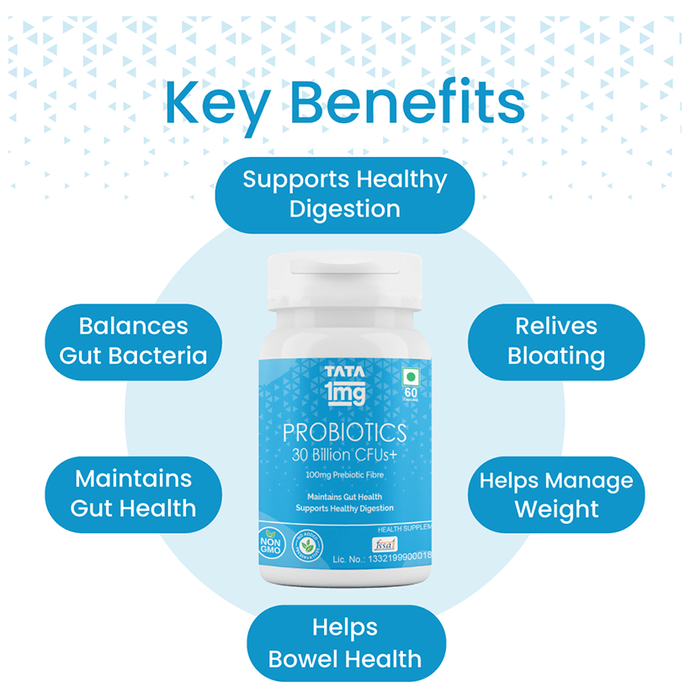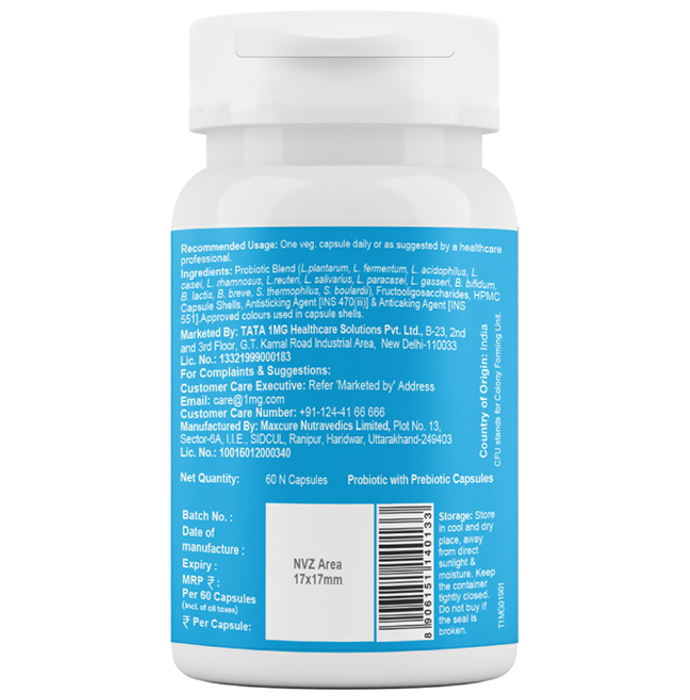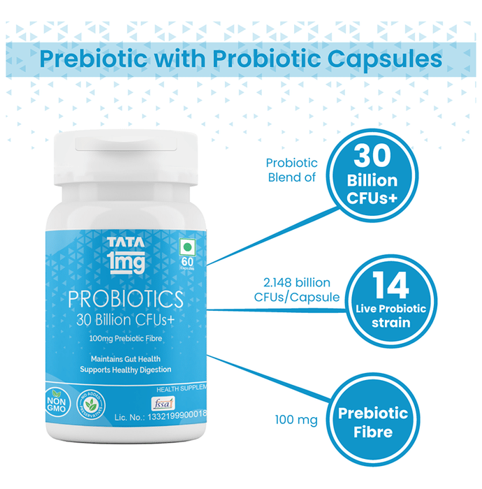 Tata 1mg Probiotics 30 Billion CFUs+ Capsule with Prebiotic Fibre provides digestive support by relieving abdominal discomfort, gas, and bloating. It contains 30 billion CFU plus and 14 live probiotic strains per capsule, which help in improving digestive health. It also contains 100 gm of prebiotic fibre to supplement the performance of liver strain. It not only helps absorb nutrients but also promotes immunity levels. It maintains gut health and supports healthy digestion. | Key Ingredients: Probiotics blend capsules 30 billion CFU plus Prebiotic fibre 14 Live strains (each strain 2.148 billion CFU/capsule) | Key Benefits: This capsule helps maintain gut health and supports healthy digestion Contains 30 billion CFU plus 14 live probiotic strains The prebiotic fibre that enhances liver function Enhances the immunity level and maintains healthy digestion It helps in relieving gas and bloating Balances gut bacteria and maintains bowel health | Good to Know: Non-GMO and has no added preservatives. | Product Form: Capsule | Directions for Use: One capsule daily or as suggested by the healthcare professional. | Safety Information: Read the label carefully before use Keep out of reach of the children Use under medical supervision Do not exceed the recommended dose Store in a cool, dry place away from direct sunlight