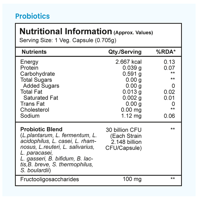 Probiotic blend capule 30 billion CFU plu Prebiotic fibre 14 Live train (each train 2.148 billion CFU/capule)