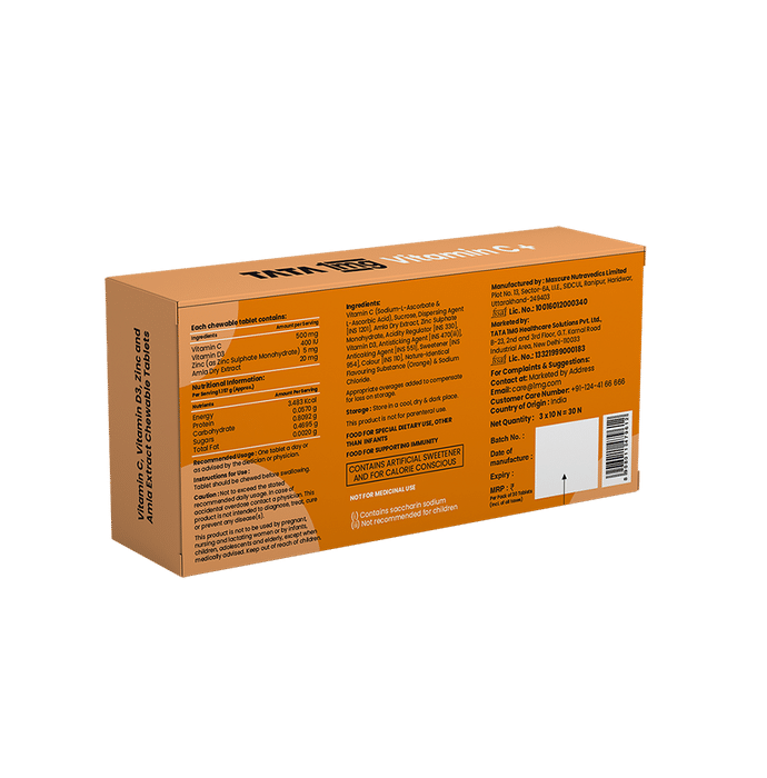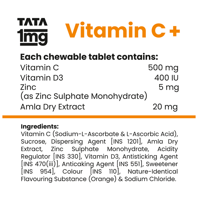 Tata 1mg Vitamin C+Vitamin D3, Zinc and Amla Extract Chewable Tablet is a dietary supplement that protects the cells and keeps them healthy. Vitamin C helps in wound healing and maintains healthy skin. Zinc aids in metabolism, and vitamin D3 helps in calcium and phosphorus absorption. | Key Ingredients: Vitamin C Vitamin D3 Zinc Amla Dry Extract | Key Benefits: Vitamin C helps maintain healthy skin and improve its quality Vitamin C also boosts immunity and protects against infectious diseases Zinc helps strengthen the immune system and metabolism function Vitamin D3 helps in the absorption of calcium and phosphorus Amla improves immune function and reduces the effects of premature ageing | Good to Know: The tablet should be chewed before swallowing. | Effects of Deficiency: Lack of vitamin C, vitamin D3, and zinc can cause: Loss of collagen Skin spots Bleeding gums | Product Form: Chewable tablet | Directions for Use: One tablet a day or as advised by the physician. | Safety Information: Read the label carefully before use Store in a cool and dry place away from direct sunlight Keep out of reach of children Do not exceed the recommended dosage This product is not intended to diagnose, treat, cure, or prevent any diseases