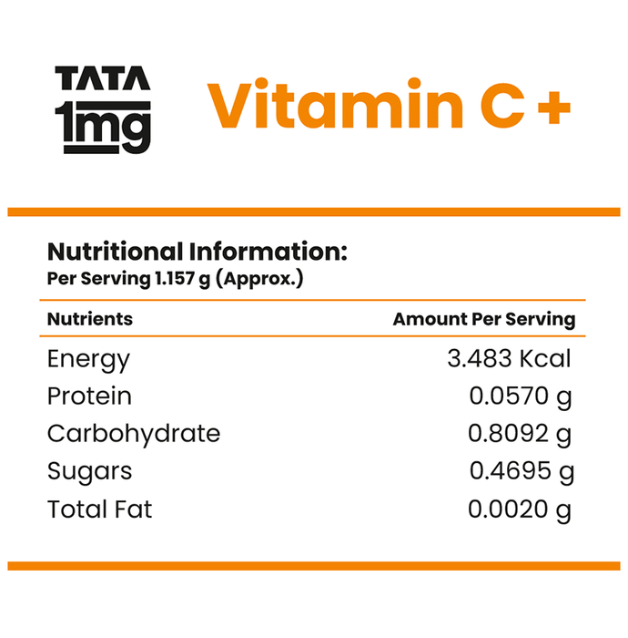 Tata 1mg Vitamin C+Vitamin D3, Zinc and Amla Extract Chewable Tablet Tata 1mg Vitamin C+Vitamin D3, Zinc and Amla Extract Chewable Tablet is a dietary supplement that protects the cells and keeps them healthy. Vitamin C helps in wound healing and maintains healthy skin. Zinc aids in metabolism, and vitamin D3 helps in calcium and phosphorus absorption.