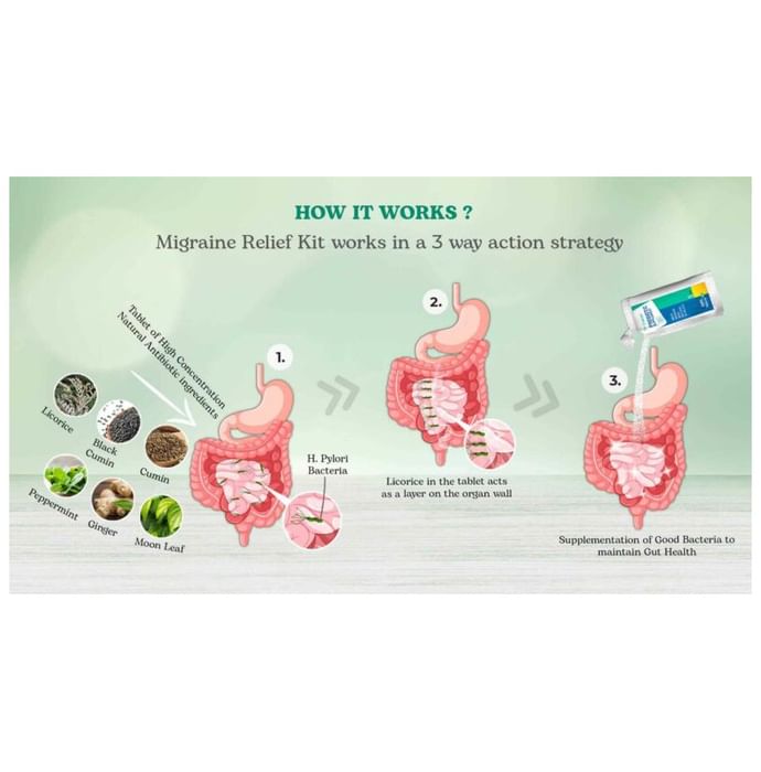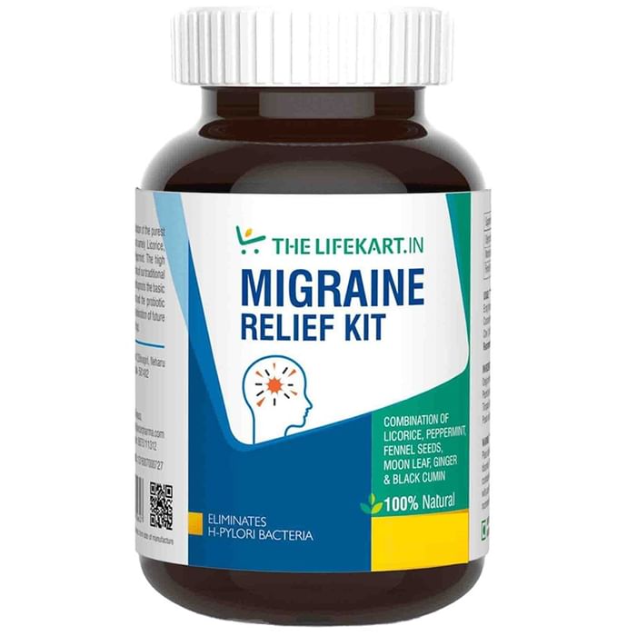 The Lifekart.In Migraine Relief 20 Days Kit help kill the existing bad bacteria, prevent the adhesion of bacteria on the cell wall and populate your gut with good bacteria. Antibiotics and unhealthy diet practices have eliminated the existence of good bacteria in our gut. We need to bring them back. TheLifeKart probiotic supplements will ensure the eradication of H. pylori bacteria and reinforce the growth of several good gut bacteria. | Key Ingredients: Moonleaf Ginger Peppermint Cumin Black cumin | Key Benefits: It may control the frequency of migraine attacks It Controls the pain intensity and duration of a migraine It reduces the anxiety caused due to stress | Directions For Use: Read the label carefully or as directed by your physician. | Safety Information: Read the label carefully before use Do not exceed the recommended dosage Store in a cool and dry place away from direct sunlight Keep out of reach of children Use under medical supervision