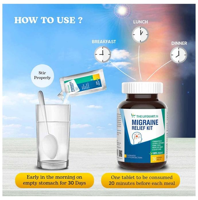 The Lifekart.In Migraine Relief 20 Days Kit (60 Chewable Tablet & 20 Probiotic Sachet) The Lifekart.In Migraine Relief 20 Days Kit help kill the existing bad bacteria, prevent the adhesion of bacteria on the cell wall and populate your gut with good bacteria. Antibiotics and unhealthy diet practices have eliminated the existence of good bacteria in our gut. We need to bring them back. TheLifeKart probiotic supplements will ensure the eradication of H. pylori bacteria and reinforce the growth of several good gut bacteria.