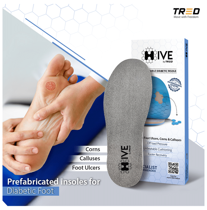 Tred Hive Diabetic Insoles for Shoes for Offloading Pressure made up of a unique multi-layer design that provides unbeatable cushioning and shock absorption. It provides all-day comfort and helps in the faster healing of wounds, ulcers and sores. | Uses: It is specially designed to provide support to the heel and help to reduce pain. | Product Specification and Features: It is made up of an anti-microbial coated, skin-friendly, super soft top layer to reduce friction, ideal for diabetics It is highly conformable and moulds itself to the user’s foot shape Its removable hexagon-shaped pegs, are customized to match individual offloading needs It effectively absorbs the impact of each step to reduce stress and fatigue | Directions For Use: As directed on the label. | Safety Information: Keep away from direct sunlight Read the label carefully before use Store in a cool and dry place Keep out of reach of the children