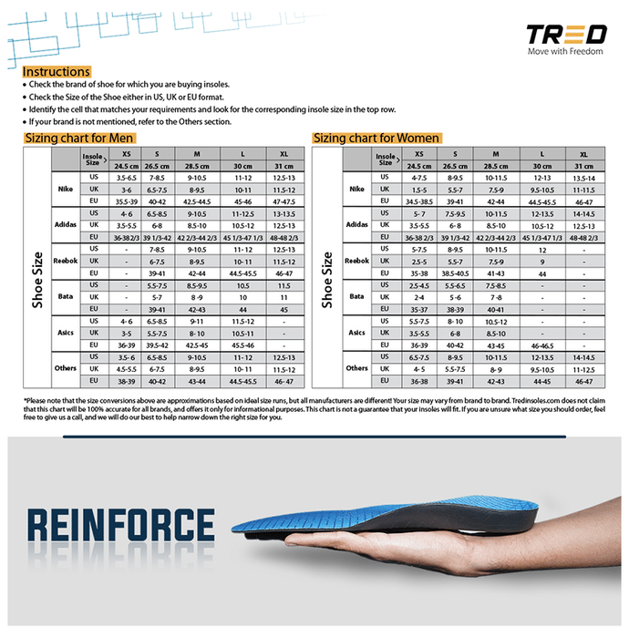 Tred Reinforce Ortho Insoles for Flat Feet with Arch Firm Support helps in improving posture, sore and aching feet. It gives comfort and relief while walking or during any activity. It is designed for superior comfort, with soft relief zones. | Uses: It helps to provide the right support for arches and redistribute weight. | Product Specification and Features: Its made up of a reinforced arch design that helps to provide the right support for arches and redistribute weight It contains deep heel cups that help to stabilize the foot by aligning your feet with the ankle, knee, and hips The proper foot alignment will help counter overpronation and supination It consists of compression pads for maximum rebound and comfort at the heel and the forefoot Non-slip material helps reduce friction, thus, increasing balance during strenuous exercise while walking or during any activity Recommended for Improving posture, arch support, comfort and relief, sore, aching feet | Directions For Use: As directed on the label. | Safety Information: Keep away from direct sunlight Read the label carefully before use Store in a cool and dry place Keep out of reach of the children