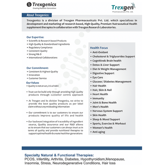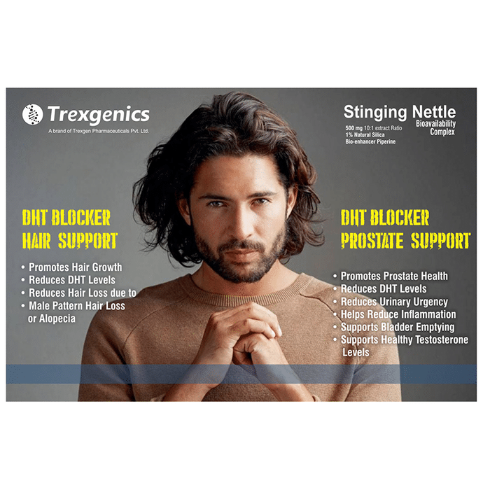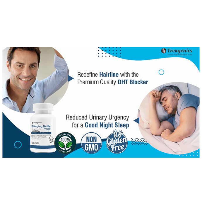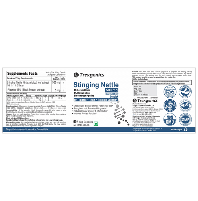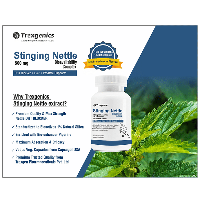 Trexgenics Stinging Nettle Veg Capsule Trexgenics Stinging Nettle Veg Capsules is a standardized natural extract with 10:1 extract ratio and 1% natural silica, which is beneficial for hair growth. Trexgenics Nettle Complex is enriched with bioavailability enhancer piperine to boost its absorption and efficacy to block DHT, reduce hair fall and hair loss along with improving prostate function by reducing inflammation and urinary urgency. Stinging Nettle is also a rich source of vitamins, minerals, essential amino acids and antioxidants.