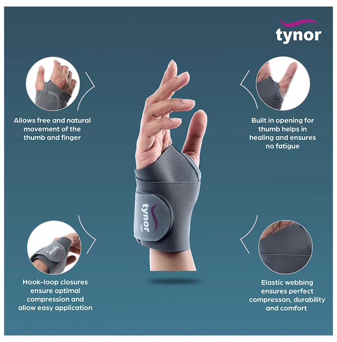Tynor E-06 Wrist Brace with Thumb Universal Tynor E-06 Wrist Brace With Thumb is designed to support, protect and partially immobilize the wrist and the palm while allowing free and natural movement of the fingers.