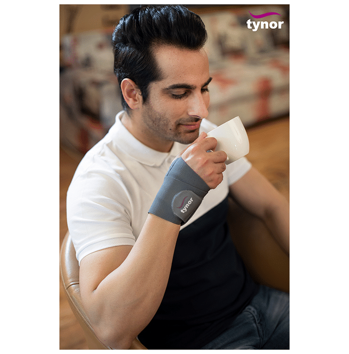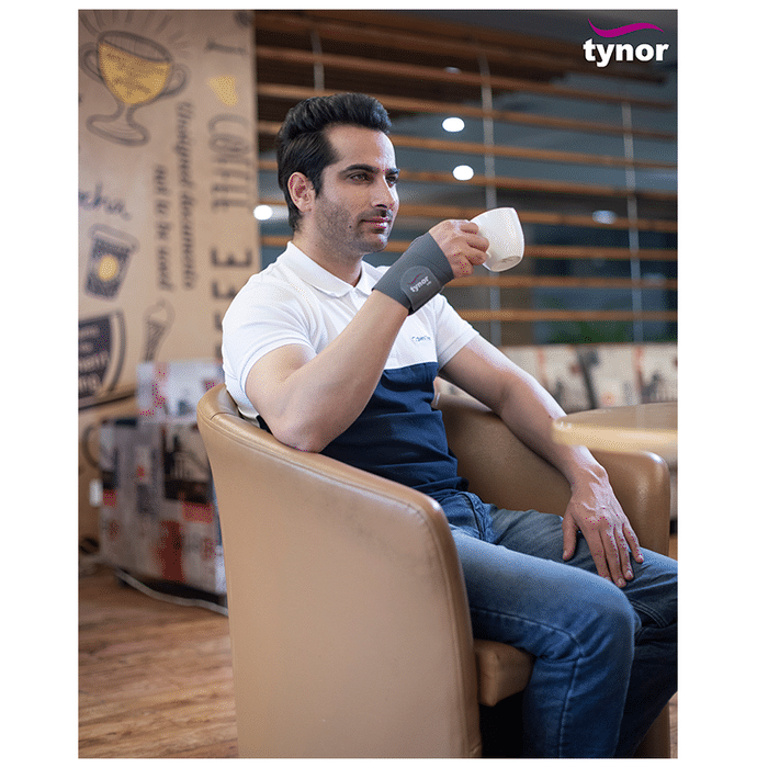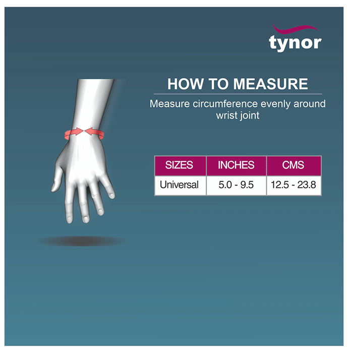 Tynor E-06 Wrist Brace With Thumb is designed to support, protect and partially immobilize the wrist and the palm while allowing free and natural movement of the fingers. | Uses: It compresses the area and retains the body heat to allay local pain and inflammation | Product Specification and Features: Excellent compressive strength, better support It has a high modulus of elasticity, retains shape and size for a long time Hook loop closures provide customized and optimal compression, ensure better fitting, universal sizing, easy application and removal Available sizes: Universal (5"-9.5") | Note: | Warranty: 6 Months | Warranty Service Type: Repair | What is covered in warranty: Manufacturing defect | Warranty Liability: Maximum to the product cost | Customer Care Id: [email protected] | Customer Care Number: 18001212656 | Directions For Use: Use a directed by the health-care professional. | Safety Information: Read the label carefully before use Keep out of reach of the children Store in a cool dry place