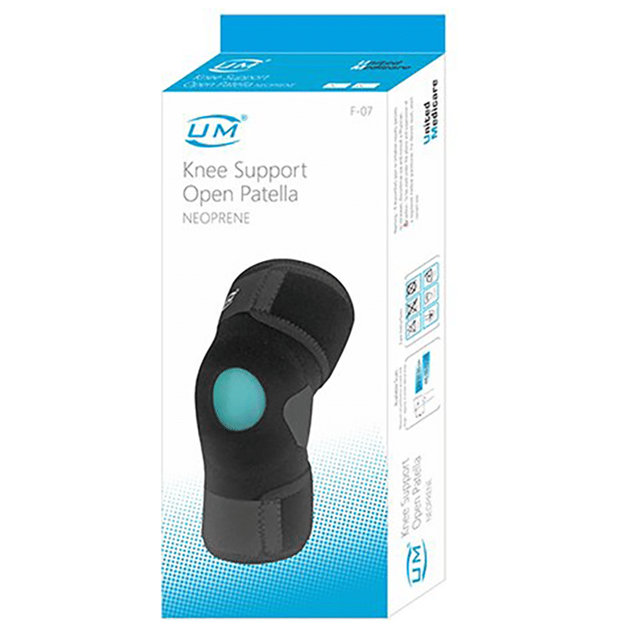 UM Knee Support Open Patella (Neoprene) supports the knees while performing daily activities. It enhances blood circulation and warmth. It helps immobilise the joints while mobilising the legs. It is also helpful in cases of different forms of injuries. | Uses: It provides relief to the knees from pain and stress. | Product Specifications and Features: This product supports the knees while performing heavy activities It enhances blood circulation It provides warmth and reduces pain and stress This product mobilises the legs while immobilising the knee joints | Directions for Use: Follow the instructions on the label. | Safety Information: Read the label carefully Store in a cool, dry place Keep it clean and hygienic Keep out of reach of children