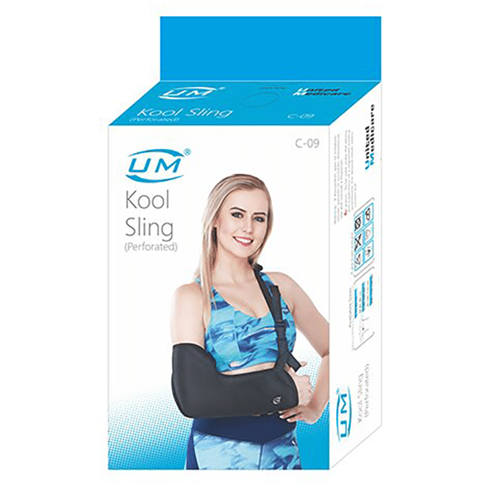 UM Kool Sling Perforated supports the arm in fractures, surgeries, and dislocation cases. It is also helpful while performing some heavy daily activities. It might help fight the pain and suffering of such conditions. This arm sling promotes blood circulation and provides warmth. | Uses: It supports the arm by providing warmth and improves blood circulation. | Product Specifications and Features: It is a carefully designed arm sling It is quite easy-to-use device This arm sling provides warmth and improves blood circulation It helps reduce pain and suffering in the arm | Directions for Use: Follow the instructions on the label. | Safety Information: Read the label carefully Store in a cool, dry place Keep it clean and hygienic Keep out of reach of children