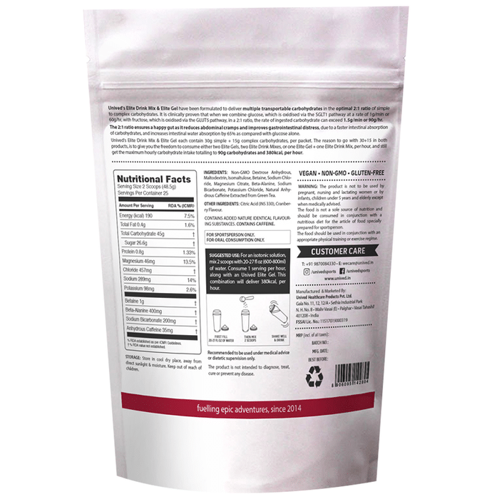 Unived Elite Drink Mix have been formulated for activities lasting greater than two hours. The Unived Elite Drink Mix have the same optimal 2:1 ratio of simple to complex carbohydrates. Both offer you 30 grams of simple carbohydrates, and 15 grams of complex carbohydrates, for a total of 45 grams of carbohydrates, and 190kcal, per serving. | Key Ingredients: Non-GMO Dextrose Anhydrous Maltodextrin Isomaltulose Betain Sodium Chloride Magnesium Citrate Beta - Alanine Sodium Bicarbonate Potassium Chloride Natural Anhydrous Caffeine Extracted from Green Tea | Key Benefits: Comes in 3 refreshing flavours - Orange Twist, Wild Watermelon and Very Cranberry Delivers energy and electrolytes Improves endurance | Directions For Use: For an isotonic solution, mix 2 scoops with 20-27 fl oz (600-800ml) of water Consume 1 serving per hour, along with an Unived Elite Gel. This combination will deliver 380kcal, per hour | Safety Information: Read the label carefully before use Store in a cool and dry place away from direct sunlight Keep out of reach of the children
