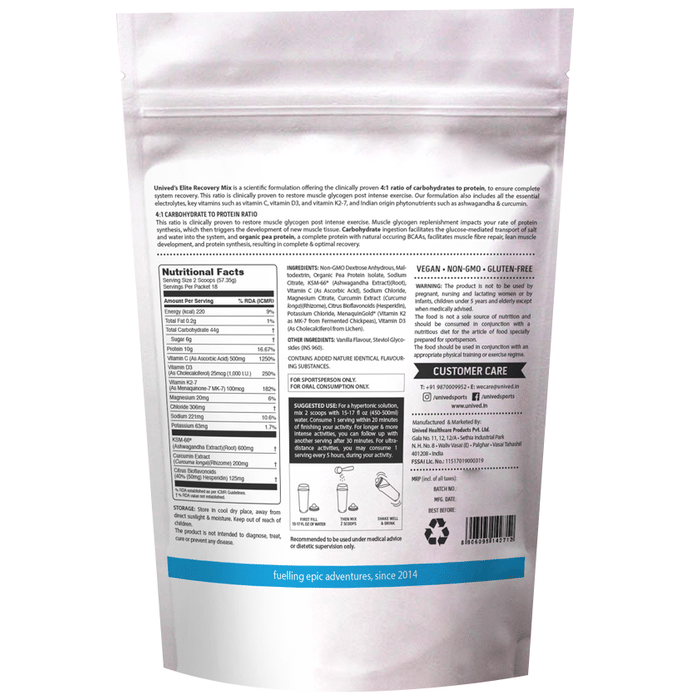 Unived Elite Recovery Mix Creamy Vanilla is a drink mix that helps to reduce muscle soreness and pain after an intensive workout. It helps the muscles and tissues to recover at a faster rate. It helps to beat the feeling of exhaustion and provides energy. | Key Ingredients: Non-GMO dextrose anhydrous Maltodextrin Organic pea protein isolate Sodium citrate Ashwagandha extract Vitamin c Sodium chloride Magnesium citrate Circumin extract Citrus bioflavonoids Potassium chloride Menaquin gold Vitamin D3 Vanilla flavour Steviol glycosides | Key Benefits: It helps to repair the damaged muscles and tissues after strenuous exercises It helps to overcome fatigue and energizes the body It helps to replace the electrolytes and key salts that the body loses while sweating It promotes cardiorespiratory fitness It helps to maintain the optimal bone health | Directions For Use: For hypertonic solution add 2 scoops to 450-500ml of water Consume 1 serving within 20 minutes of finishing your activity After intense workouts, a second serving can be taken 30 minutes after the first serving For more information, refer to the label | Safety Information: Store in a cool and dry place Keep out of reach of children Pregnant, lactating or lactating women should not consume this product It should not be given to children under the age of 5 It should not be consumed as a sole diet It should only be consumed by those who perform strenuous physical tasks