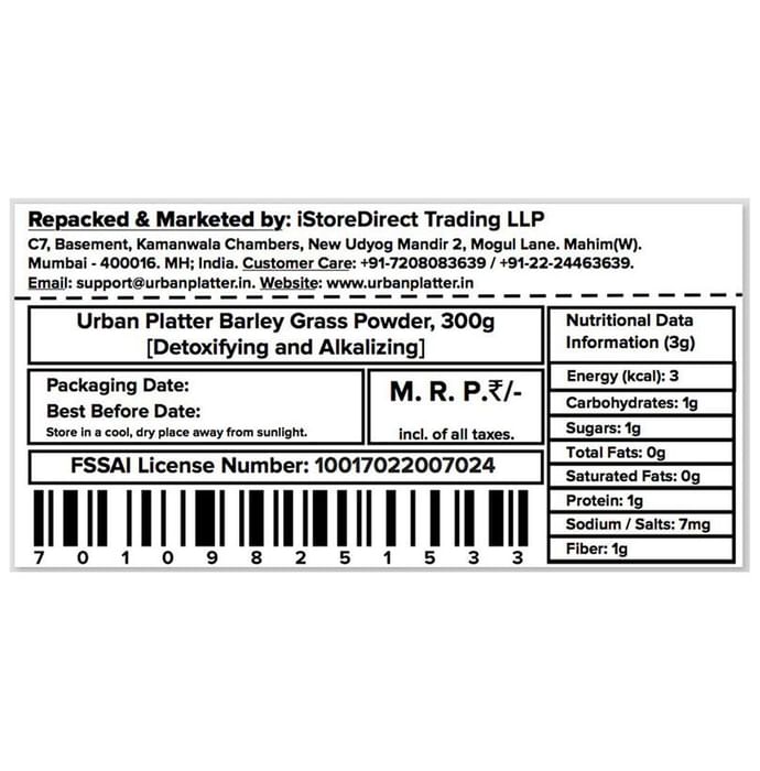 Urban Platter Barley Grass Powder Urban Platter Barley Grass Powder is rich in vitamins A, C, B1, B2, folic acid, and B12, calcium, iron, potassium and chlorophyll. Barley Grass is known to promote a healthy skin and strong immune system. It is used in the treatment of acidity and promotes healthy bones.