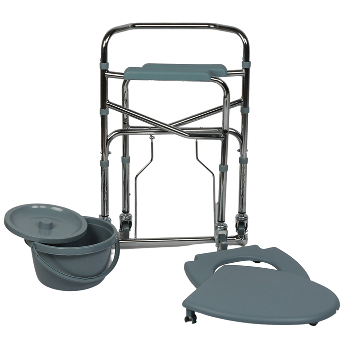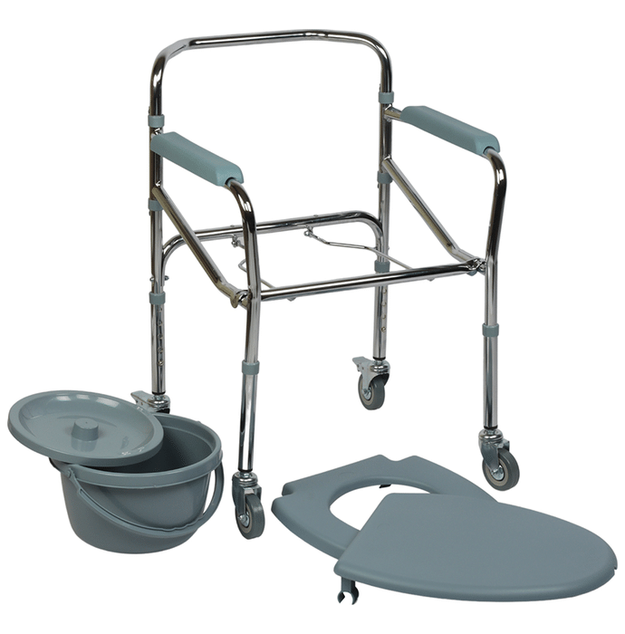 VMS Careline VWE 1032 Standard Foldable Commode Wheelchair with Long Bucket and Splash Guard comes with a foldable design that helps to transport and store easily. It has a steel frame with height adjustment from 17.5 to 21.5 inches and a net weight of 9 kg. It is user-friendly and safe to use. | Uses: It is a spacious wheelchair that comforts the patient, seniors and the differently abled. | Product Specifications and Features: It comes with a foldable design that helps to easily transport and store It provides a comfortable experience for people of varying heights It has cushioned armrests that provide both comfort and convenience It contains pivoting wheels that help in easy transport | Directions For Use: Use as directed in the instruction manual. | Safety Information: Store in a cool and dry place Keep out of the reach of children Read the manual carefully