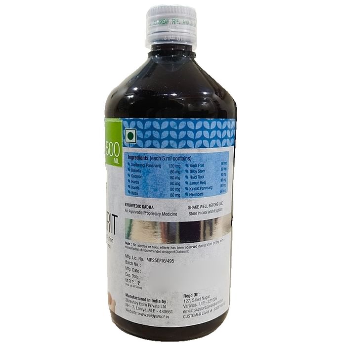 Vaidyamrit Diabamrit Ayurvedic Diabetic Potion Diabamrit Kwath is a combination of natural herbs and ingredients that have shown promise in lowering blood sugar. This Ayurvedic concoction may not only help in reducing blood sugar but also protect the body from damages caused by diabetes. Diabetes majorly affects the eyes, brain, heart, liver and kIdney. Diabamrit can also be used by individuals with a family history of diabetes as a preventive medication. | Key Ingredients: Saptarangi panchang Amla fruit Bhaeda Giloy stem Gudmar Haldi root | Key Benefits: Helps lower blood sugar and increase insulin sensitivity Helps in correcting digestive and metabolic functions May help protect the kidney, eyes and nerves from the effects of diabetes | Directions For Use: 2 full tablespoons in the morning empty stomach and at bedtime Or as directed by the physician | Safety Information: Read the label carefully before use Keep away from reach of children Store in a cool and dry place away from direct sunlight