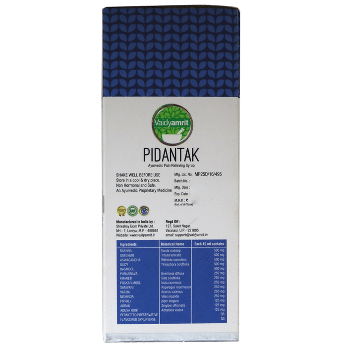 Vaidyamrit Pidantak Ayurvedic Pain Relieving Syrup is an Ayurvedic medicine for arthritis and related issues that can be used for relieving joint pain. It contains powerful Ayurvedic ingredients and time-tested, authentic natural herbs. Pidantak Syrup works by effectively reducing the inflammation and stiffness of joints which results in easing their stiffness and pain. It may also help in the promotion of synovial fluid synthesis and in improving blood circulation to joints. | Key Ingredients: Rashna Gokshur Ashwagandha Giloy Dasmool Punarnava Khareti Puskar mool | Key Benefits: Helps in controlling swelling, oedema and arthritis Useful in spondylitis or any general joint pain Useful in gout, stiffness and inflammation | Directions For Use: Adult: 10-15 ml twice a day before meal Children: 5-10 ml twice a day before meal Or as directed by the physician | Safety Information: Read the label carefully before use Keep away from reach of children Store in a cool and dry place away from direct sunlight